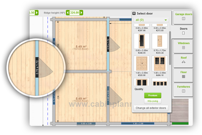 Cabinplanner ⑤ suteikia vartotojui galimybę pasirinkti įvairių rūšių medienos storį, stogo stilių, langus ir duris bei daugybę kitų techninių savybių, todėl mūsų konfigūratorius yra labai patogus ir universalus. Mūsų konfigūratorius turi patogią sąsają ir yra skirtas intuityviam naudojimui. Mes nuolat dirbame kurdami savo konfigūratorių, kad pasiūlytume dar daugiau galimybių ir galimybių.